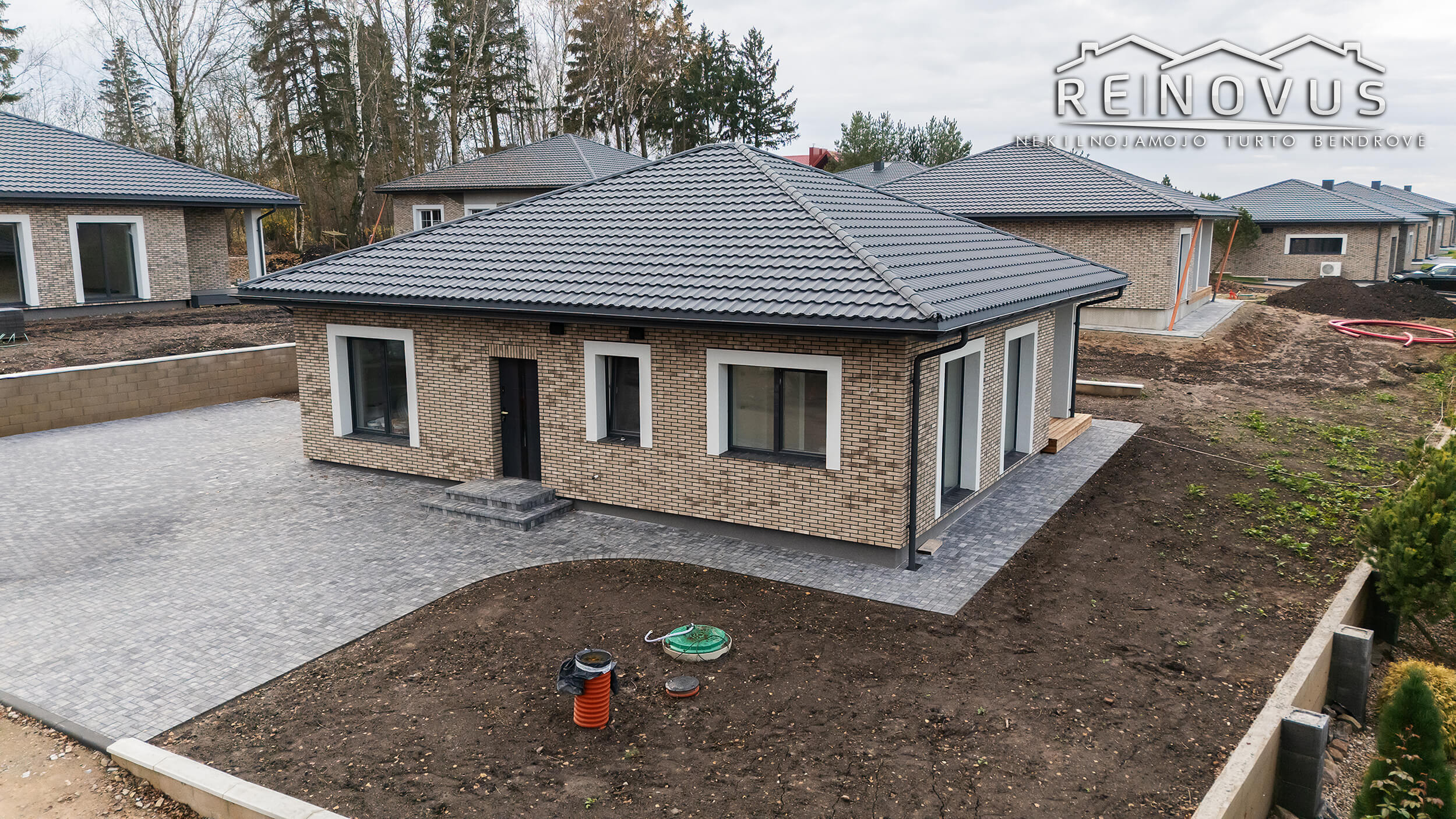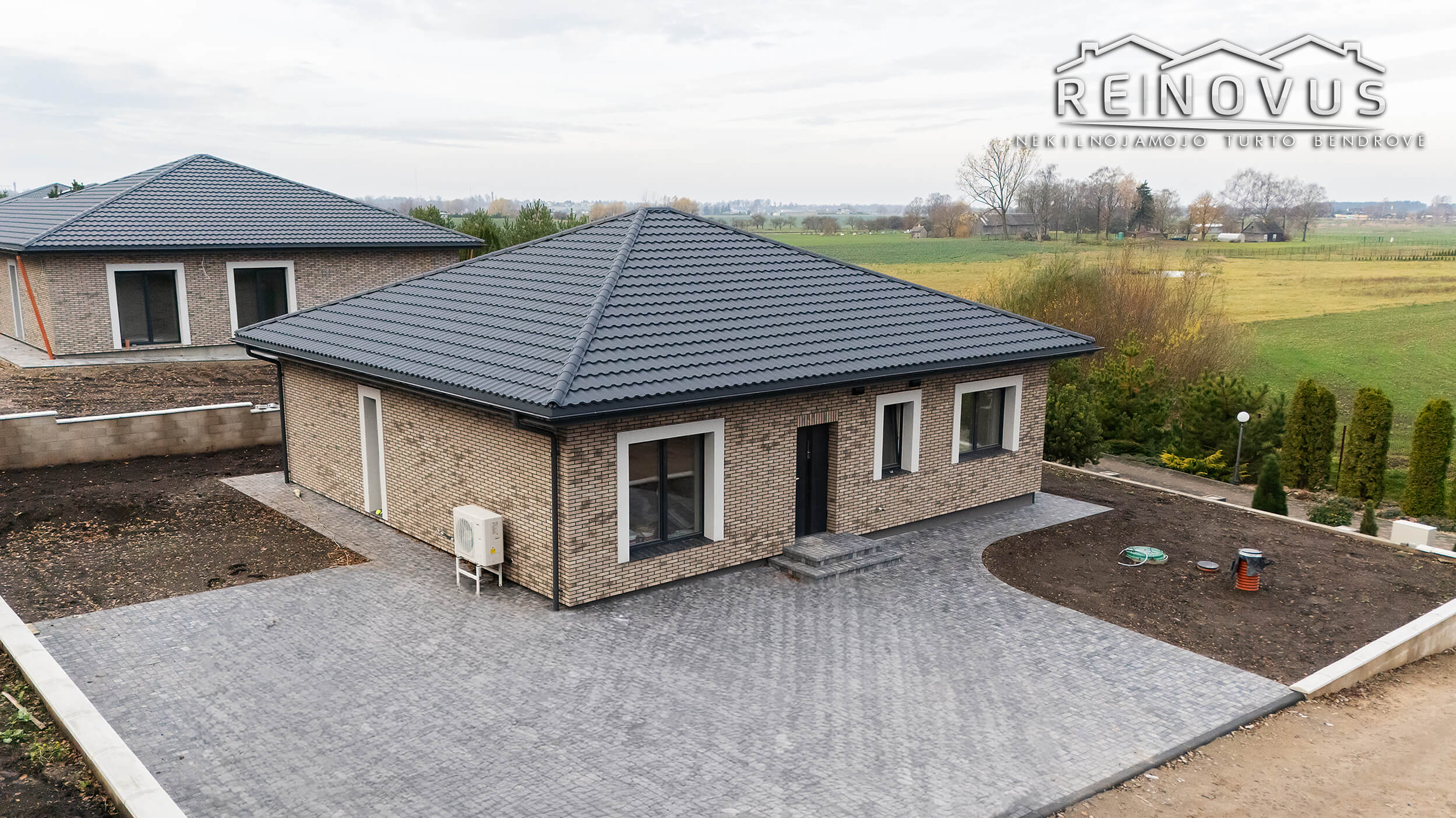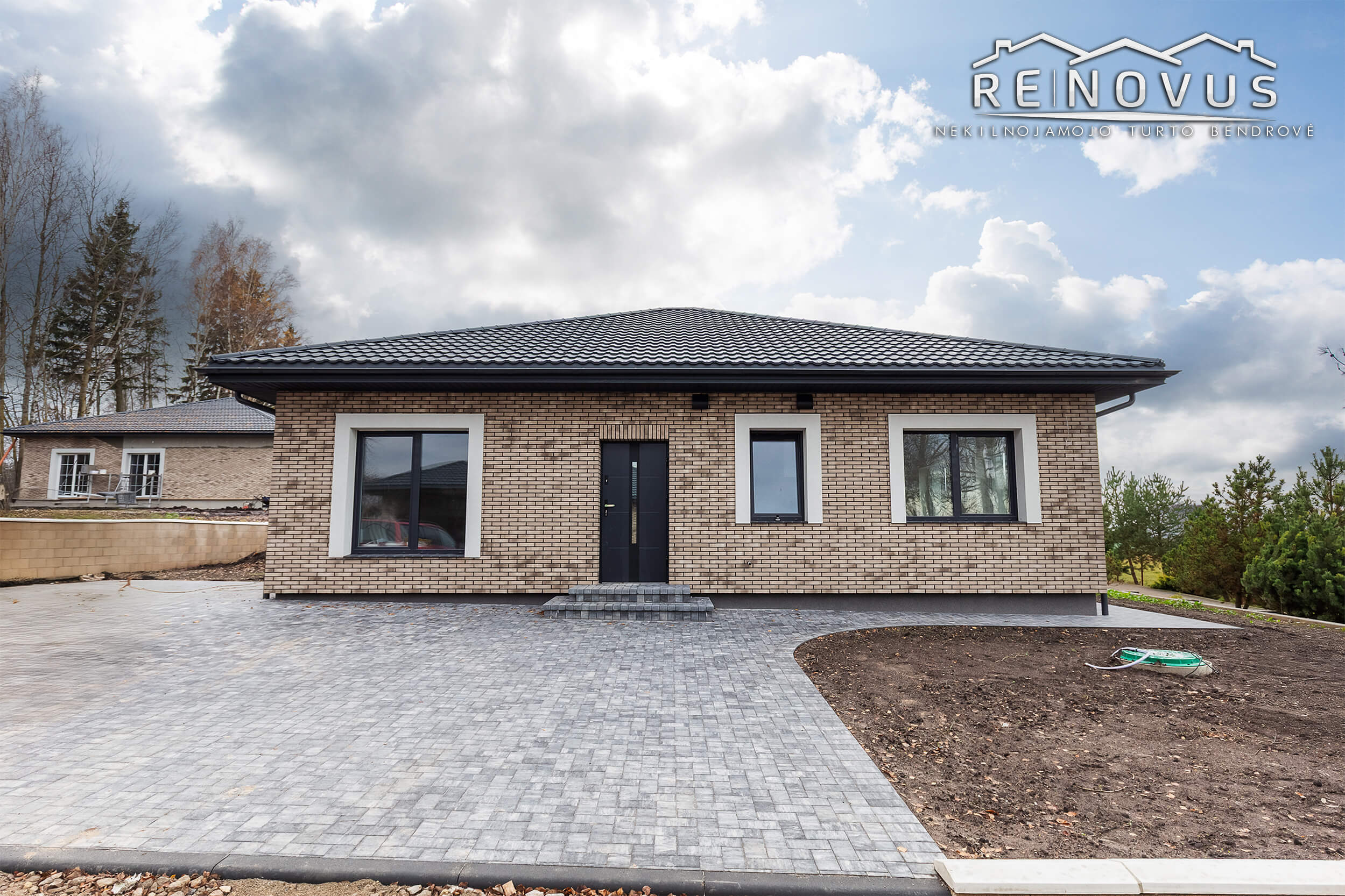 – Trinkelėmis išklotas įvažiavimas, parkingas 2 automobiliams ir takai aplink namą.
