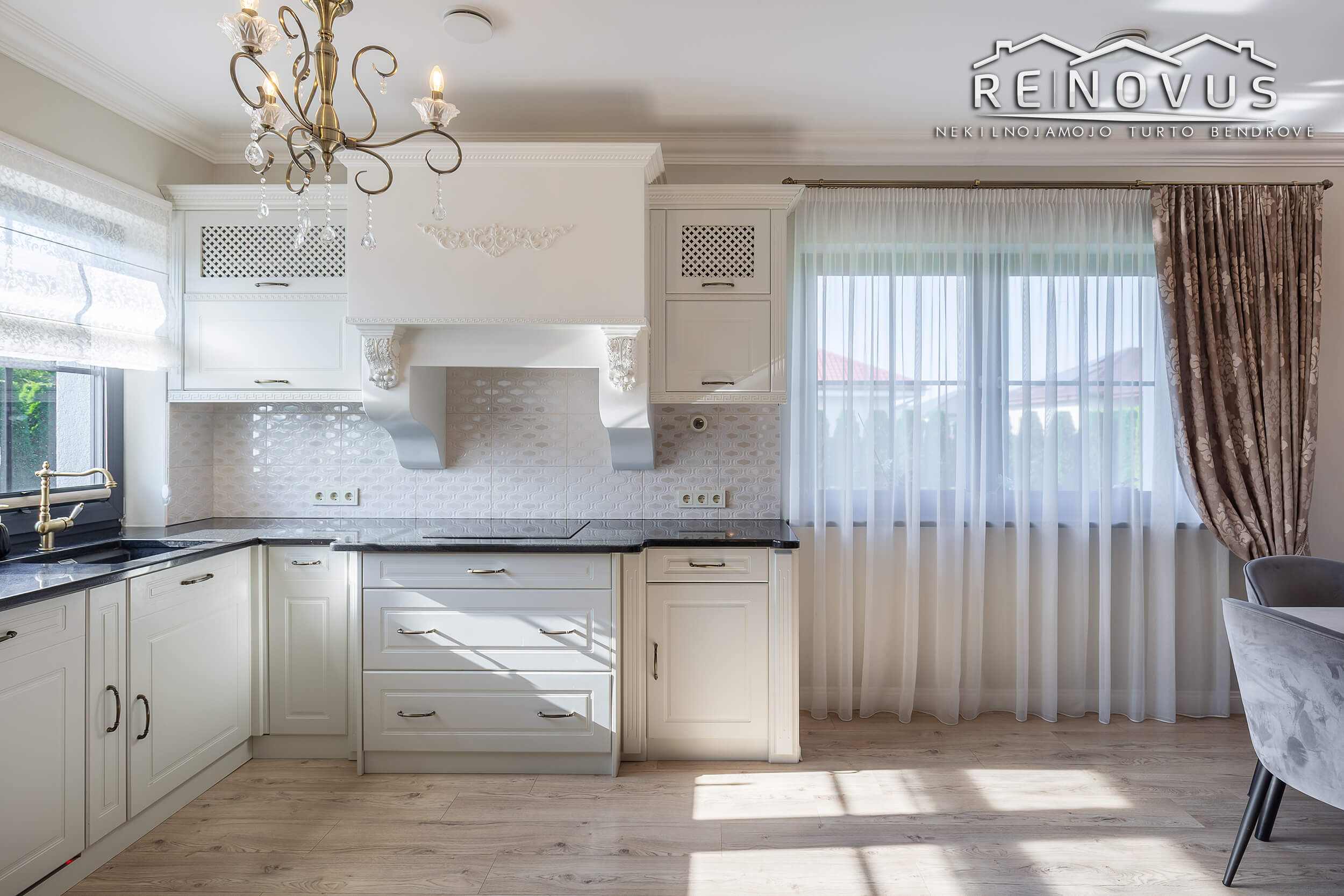• Virtuvės integruoti baldai – natūralaus medžio, akmens masės stalviršis su lieta plautuve.