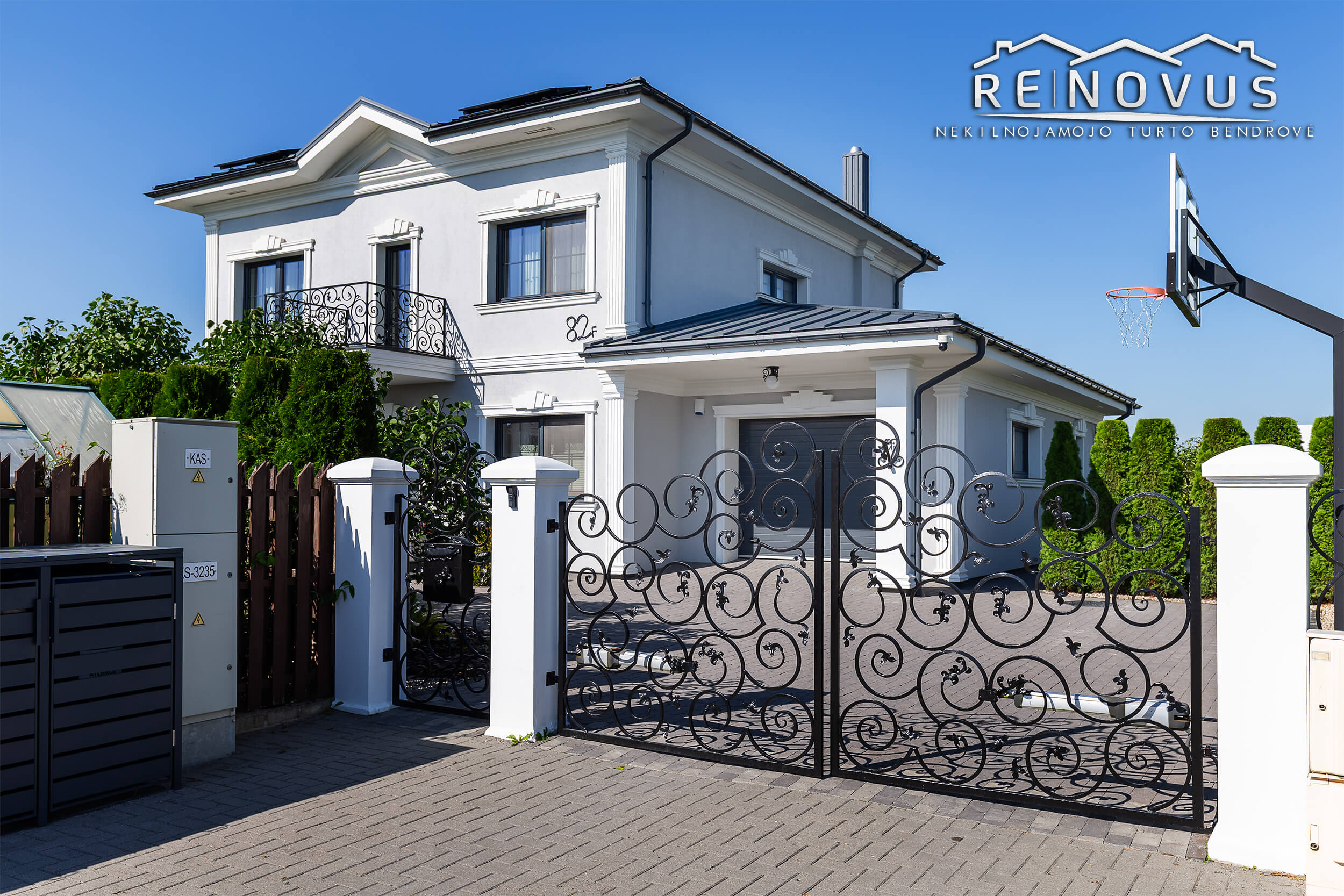 Sklypas – 8,65 arų, pilnai apjuostas tvora ir apsodintas tujomis, kalnų pušelėmis + automatiniai kalvio darbo vartai su domofonspyne + kalvio darbo šviestuvai ir pilnas kiemo apšvietimas, išklotos skandinaviškos trinkelės + žoliapjovė-robotas;