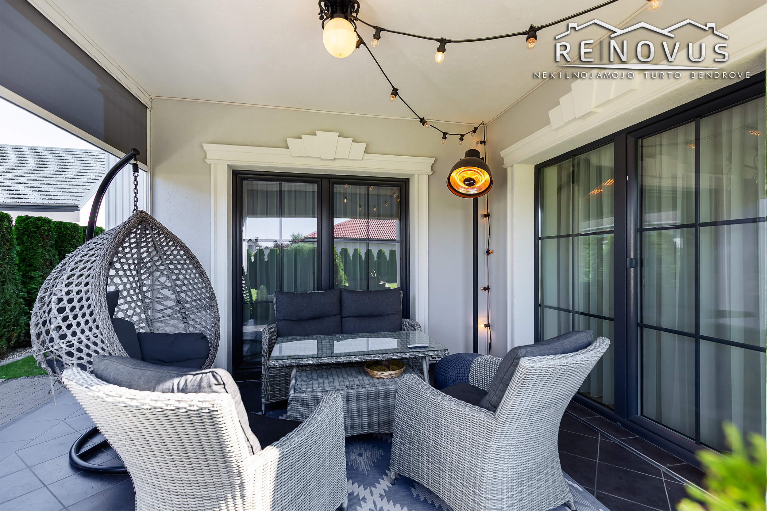 Terasa po stogu: išklota klinkeriu, lauko baldai, ZIP Screen sistema (apsauganti nuo saulės, vėjo ir lietaus).
